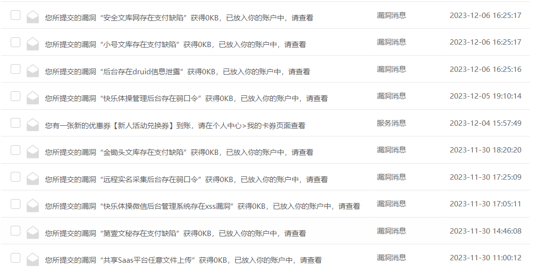 参加了11月的新人活动,一开始怕没奖品,用室友的账号也交了洞,最后共计成功收录了18个洞,我俩各九个,只能说小漏洞,你找,肯定是有的,但是就是体现不出什么技术就是了哈哈