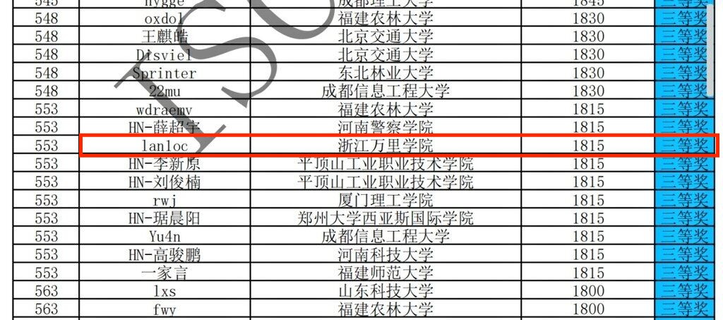 接着就是省赛了,只能说运气好吧,本来想着,按去年的题目难度,或许冲个二等应该没问题,但今年题目全面变难了,web方向就搞出了一题,好在,拉来一个大爹撑腰,初赛最后名次14我记得