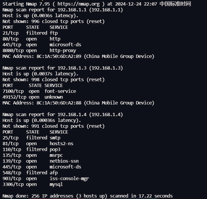 然后闲来无事,想着用用自己的三脚猫功夫随便看看,蛮扫了一下,大概房间正常吧,三个设备,一个我电脑,然后路由器,然后一个智能电视