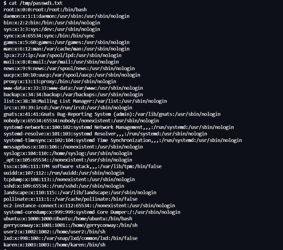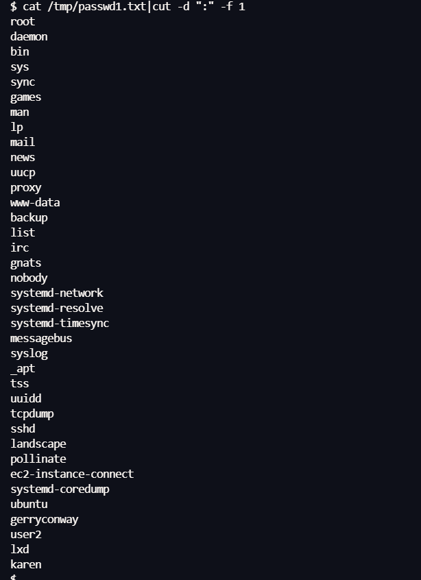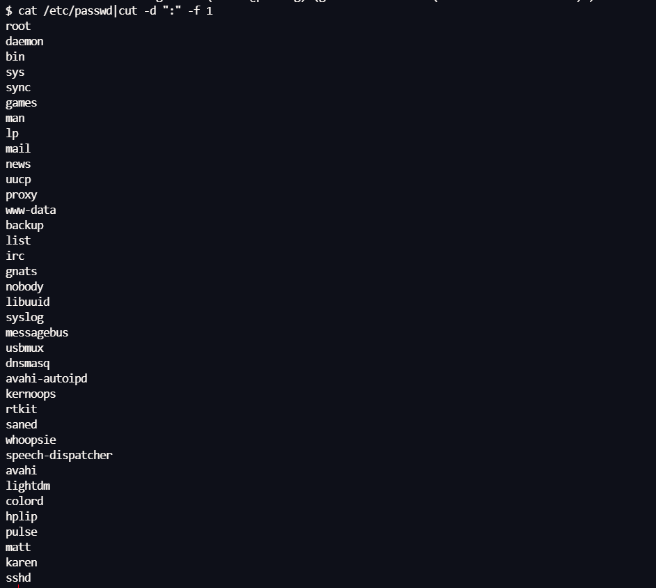 1 | cat /etc/passwd|cut -d ":" -f 1 |