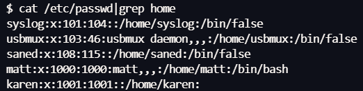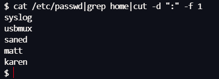 1 | cat /etc/passwd|grep home|cut -d ":" -f 1 |