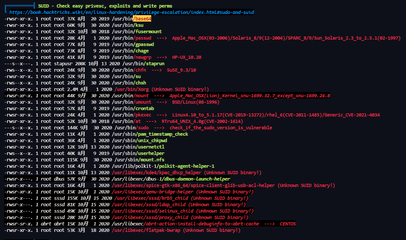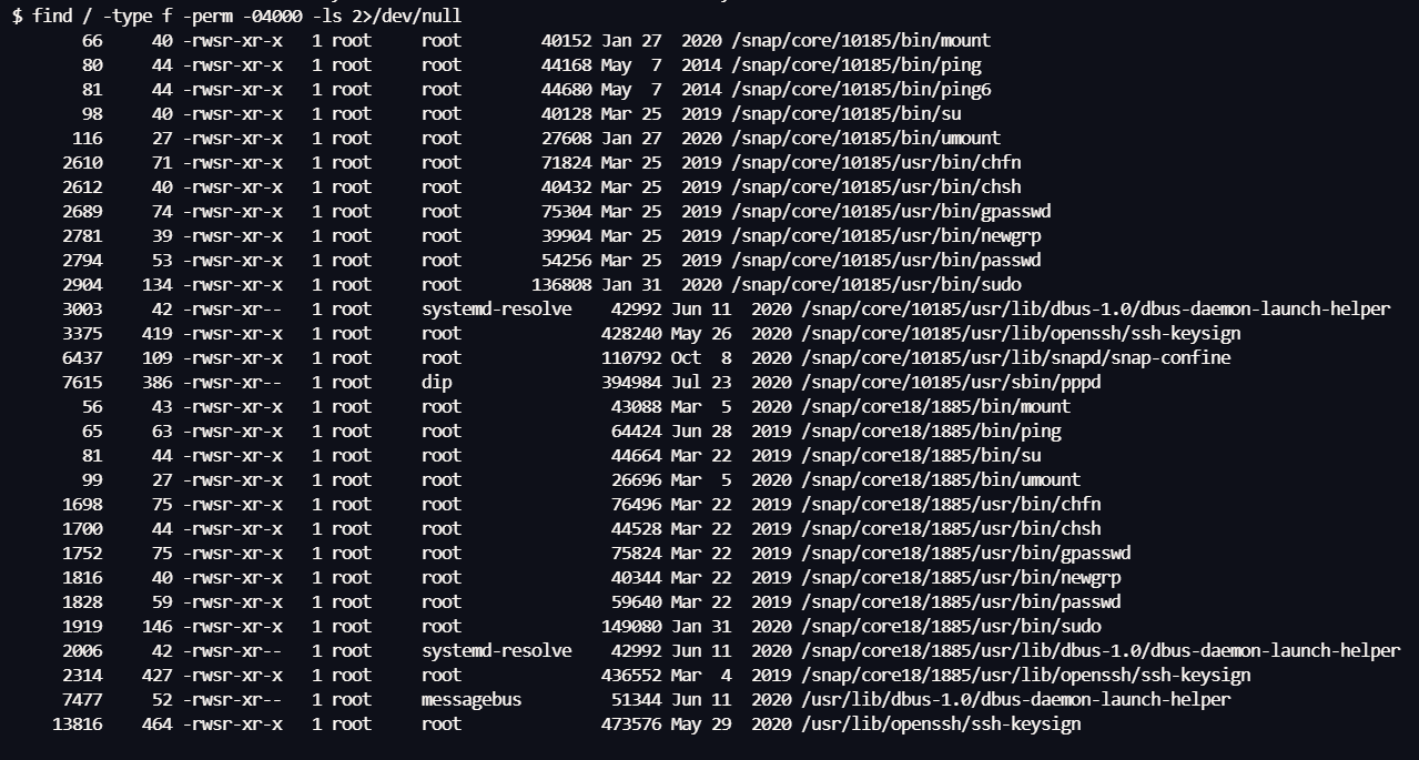 1 | 查找具有 SUID 位的文件,这允许我们以比当前用户更高的权限级别运行文件 |