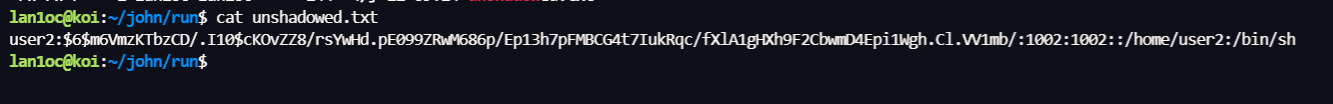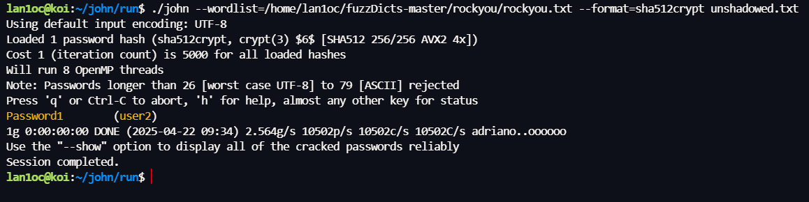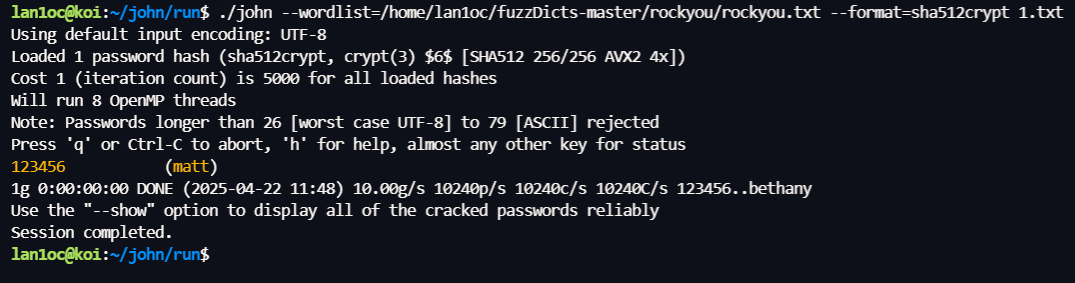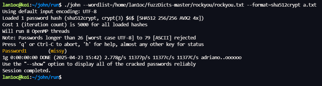 1 | ./john --wordlist=/home/lan1oc/fuzzDicts-master/rockyou/rockyou.txt --format=sha512crypt a.txt |