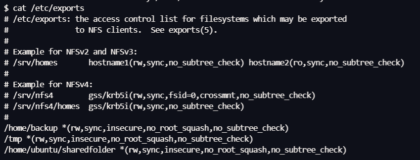 NFS(网络文件共享)配置保存在 /etc/exports 文件中。此文件是在 NFS 服务器安装期间创建的,通常可由用户读取