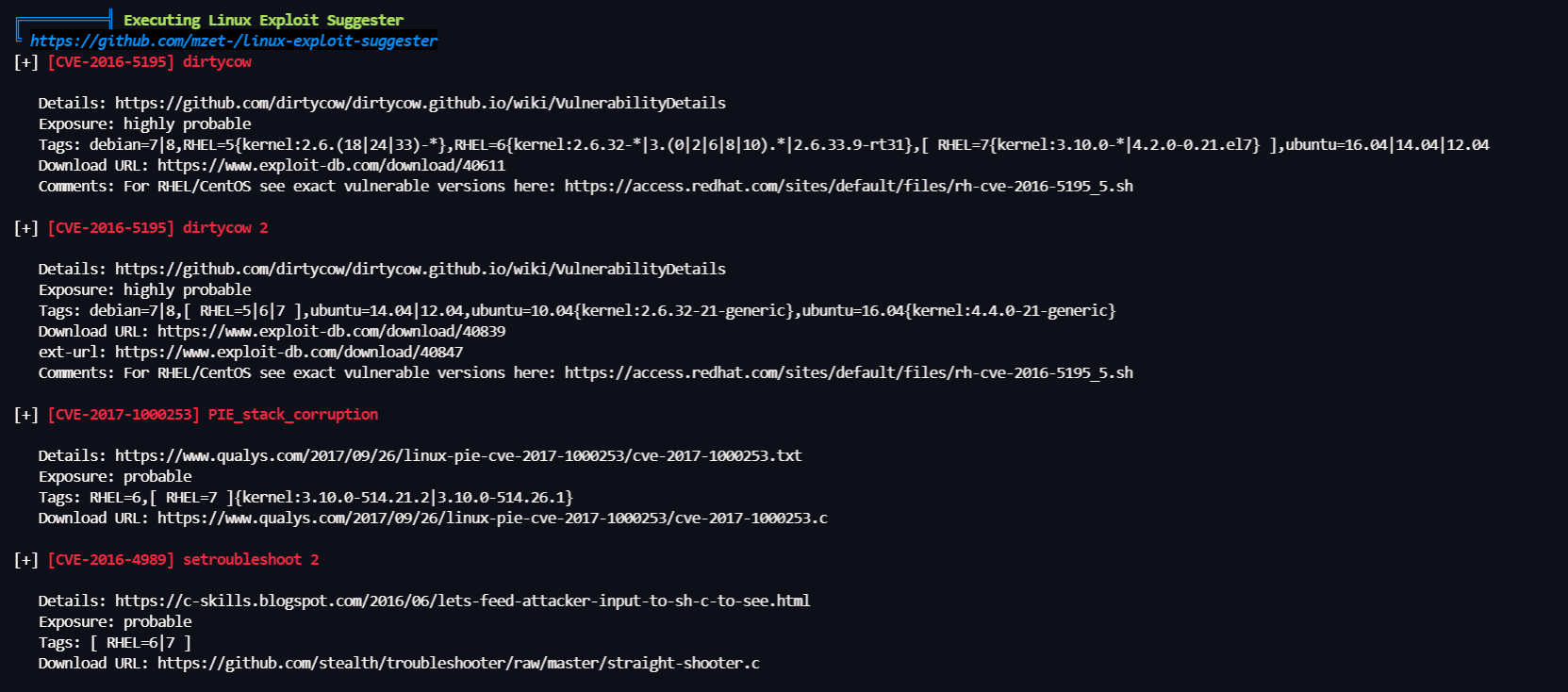 有几种工具可以帮助您在普查过程中节省时间。这些工具仅用于节省时间,因为它们可能会错过一些权限提升向量。以下是流行的 Linux 枚举工具列表,以及指向其各自 Github 存储库的链接。
