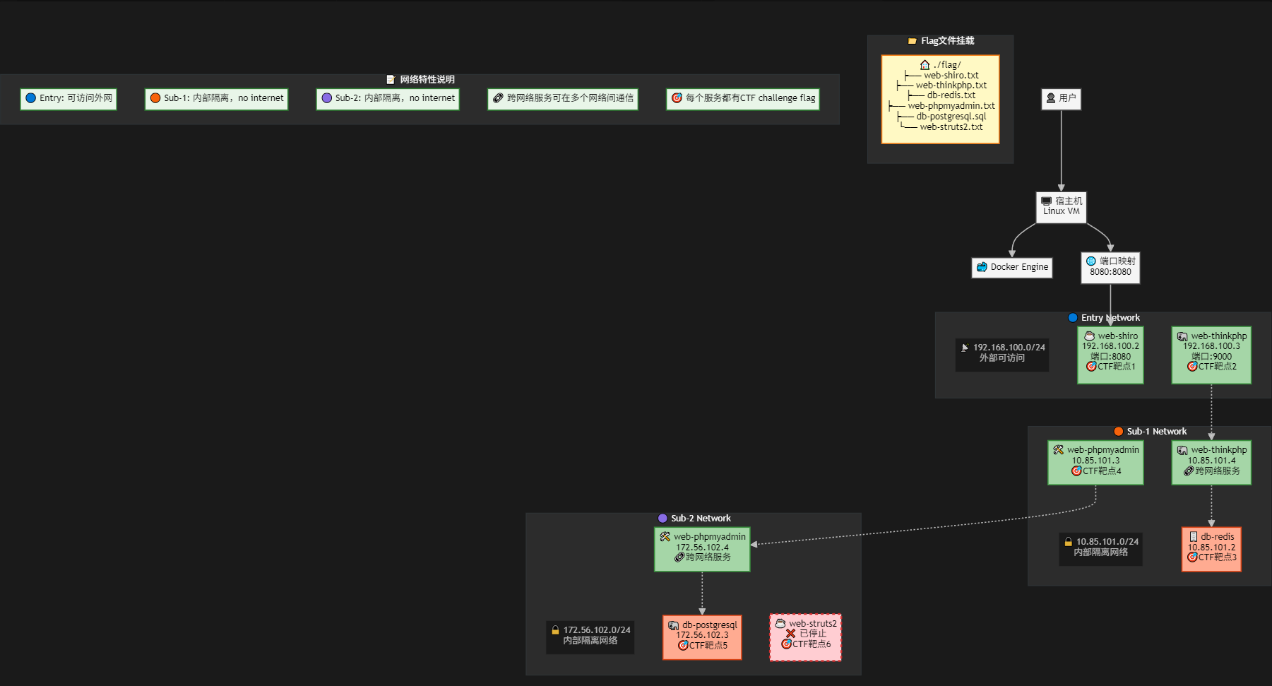 | 内网目标机 | 192.168.100.3 | 内网资产 | 目标机,开放80端口 |