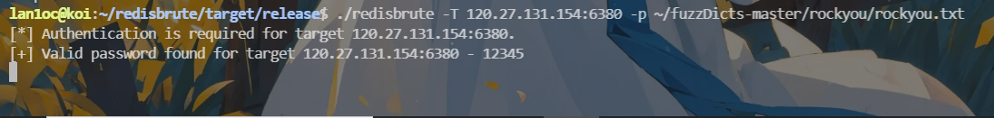 1 | ./redisbrute -T 120.27.131.154:6380 -p ~/fuzzDicts-master/rockyou/rockyou.txt |