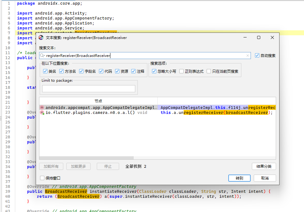 BroadcastReceiver组件可动态注册,即在代码中使用registerReceiver()方法注册BroadcastReceiver,只有当registerReceiver()的代码执行到了才进行注册,取消时则调用unregisterReceiver()方法。但registerReceiver()方法注册的BroadcastReceiver是全局的并且默认可导出的,如果没有限制访问权限,可以被任意外部APP访问,向其传递Intent来执行特定的功能。因此,动态注册的BroadcastReceive可能导致拒绝服务攻击、APP数据泄漏或是越权调用等风险。