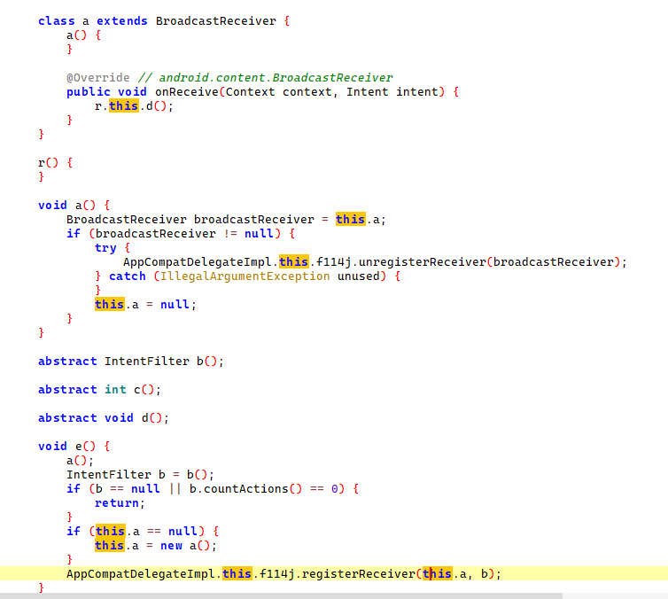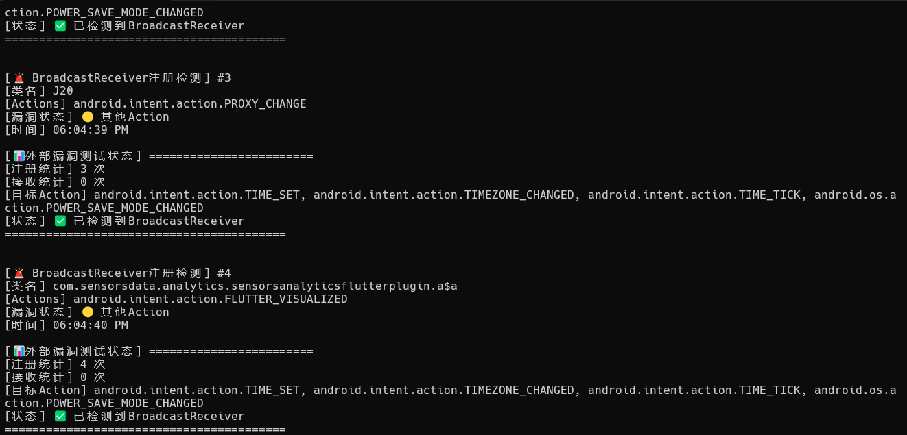 然后写了个脚本现在能注册BroadcastReceiver组件了,但是用adb一发送外部广播,frida就断开连接,说明反调试机制很强?不知道反正通过调试拿到了四个action