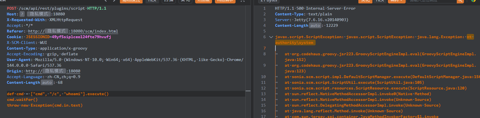 | POST /scm/api/rest/plugins/script HTTP/1.1 Host: X-Requested-With: XMLHttpRequest Accept: */* Referer: /scm/index.html Cookie: JSESSIONID=49yf5siplceo124fte79hvufj X-SCM-Client: WUI Content-Type: application/x-groovy Accept-Encoding: gzip, deflate User-Agent: Mozilla/5.0 (Windows NT 10.0; Win64; x64) AppleWebKit/537.36 (KHTML, like Gecko) Chrome/144.0.0.0 Safari/537.36 Origin: Accept-Language: zh-CN,zh;q=0.9 Content-Length: 68