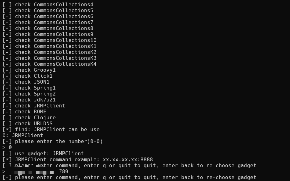 out.append("\n============= 依赖库探测 =============\n") def checks = [ "Commons-Collections 3": "org.apache.commons.collections.functors.InvokerTransformer", "Commons-Collections 4": "org.apache.commons.collections4.functors.InvokerTransformer", "Commons-Beanutils": "org.apache.commons.beanutils.BeanComparator", "Shiro Core": "org.apache.shiro.SecurityUtils" ]